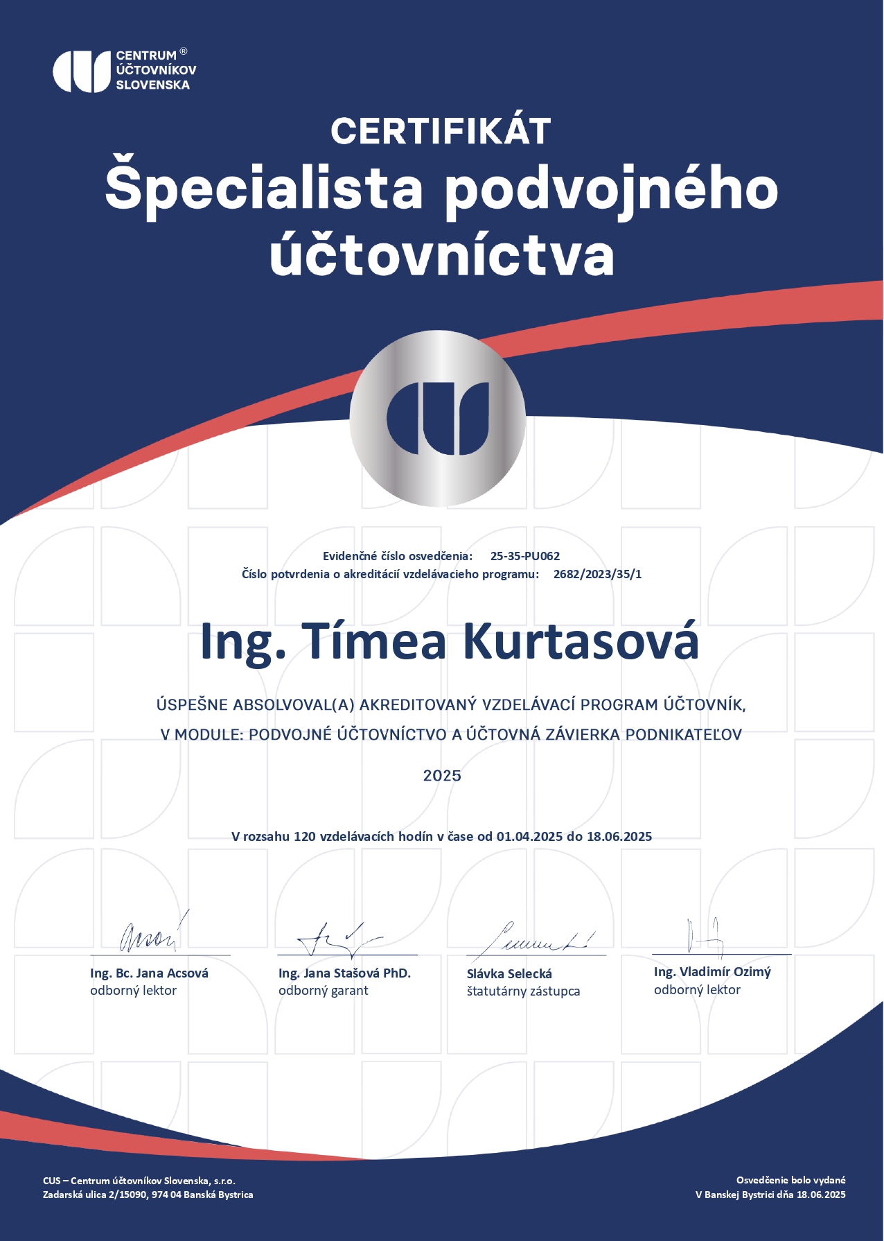V roku 2025 úspešne absolvovala akreditovaný vzdelávací program “Účtovník” so zameraním na modul „Podvojné účtovníctvo a účtovná závierka podnikateľov“.